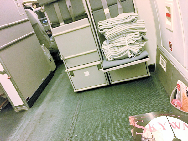 いよいよ、ひさしびりの JAL 国際線でのフライトです。座席は非常口シートです。目の前には毛布が積まれていますが、CAさんが座るジャンプシートがあります。左前はギャレーなので、短距離路線はずっと戦場さながらでバタバタしていますが、足元が広いのがうれしいです。CAさんのジャンプシートの背中側がトイレです。